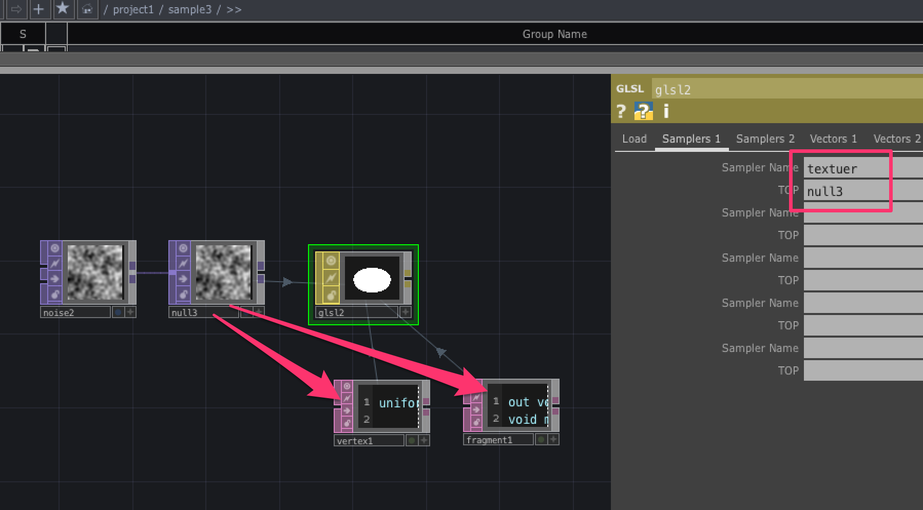 テクスチャの情報をGLSLで受け取るためには、GLSL MATのSample 1タブのTOPにテクスチャ用のTOPオペレーターを設定します。そしてSampler Nameにシェーダー側で値を受け取るための変数名を設定します。