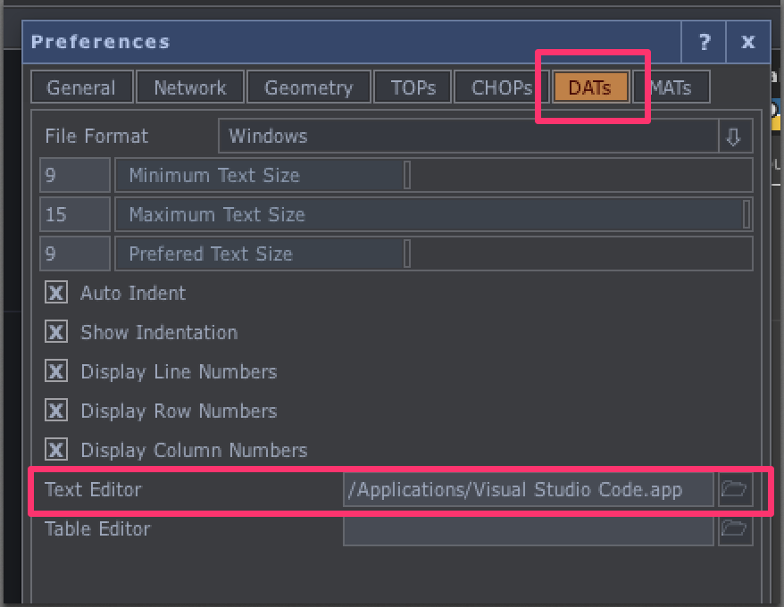 ツールバーのTouchDesigner > Preferencesを選びます。 あとはDATsのタブからエディタを選択します。