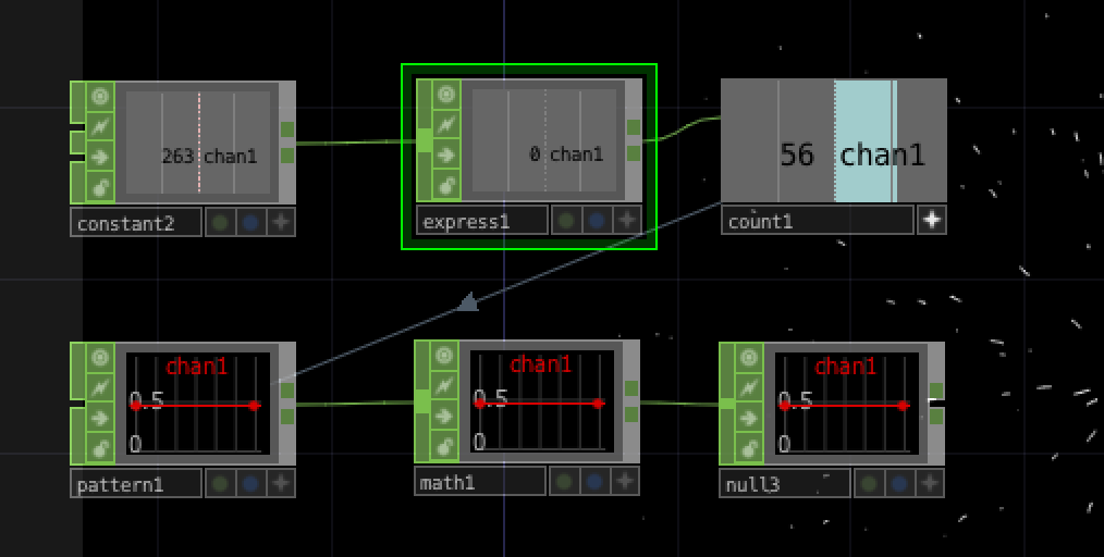 そして、Expresstion CHOPをCount CHOPに繋ぐことで、600フレームごとに1カウントずつインクリメントされていきます。