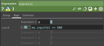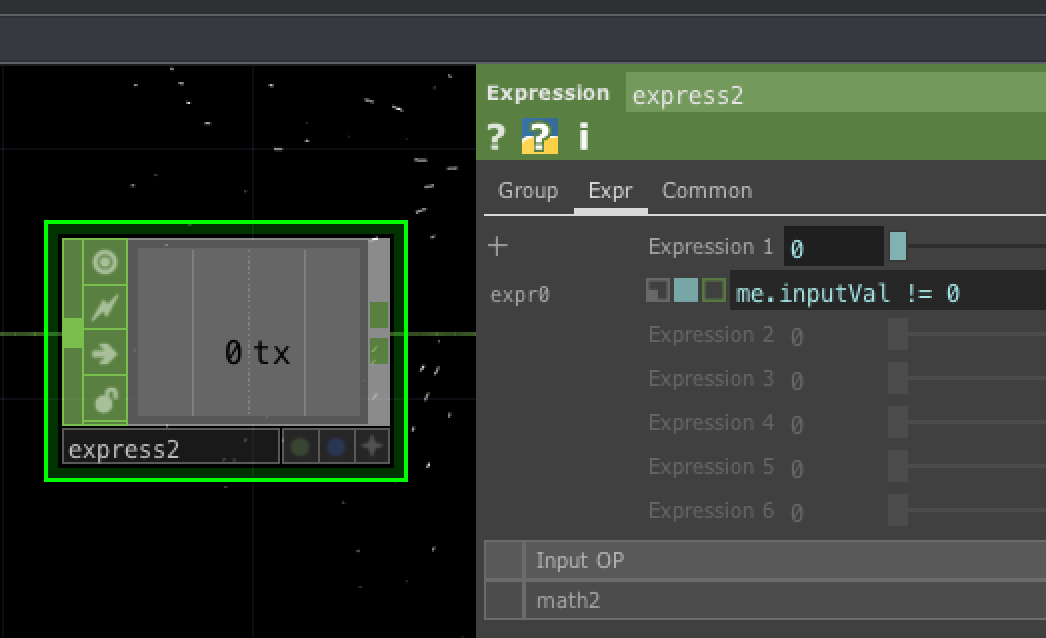 Math CHOPで引き算した値をExpression CHOPを使って判定します。 判定する式はme.inputVal != 0とします。