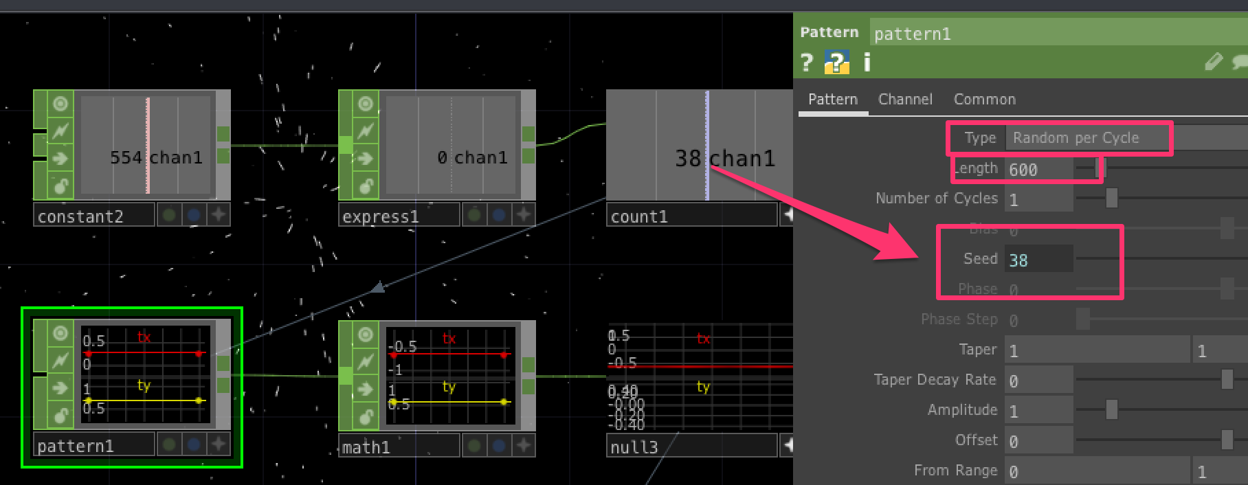 Count CHOPの値をPattern CHOPのSeed代入します。 TypeをRandom per Cycleにします。lengthには600を設定します。なぜ600なのかがよくわかりませんでした。。。