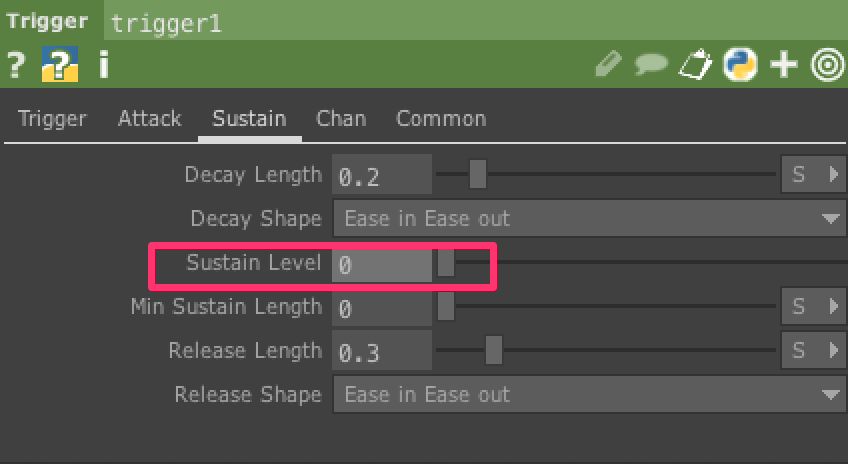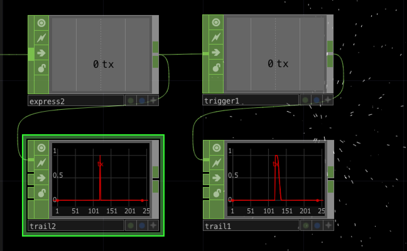 Expression CHOPの値をそのまま使うと、値の変化が急すぎてパーティクルが一瞬しか見えません。 そこで、Trigger CHOPを使って、値の変化を調整します。