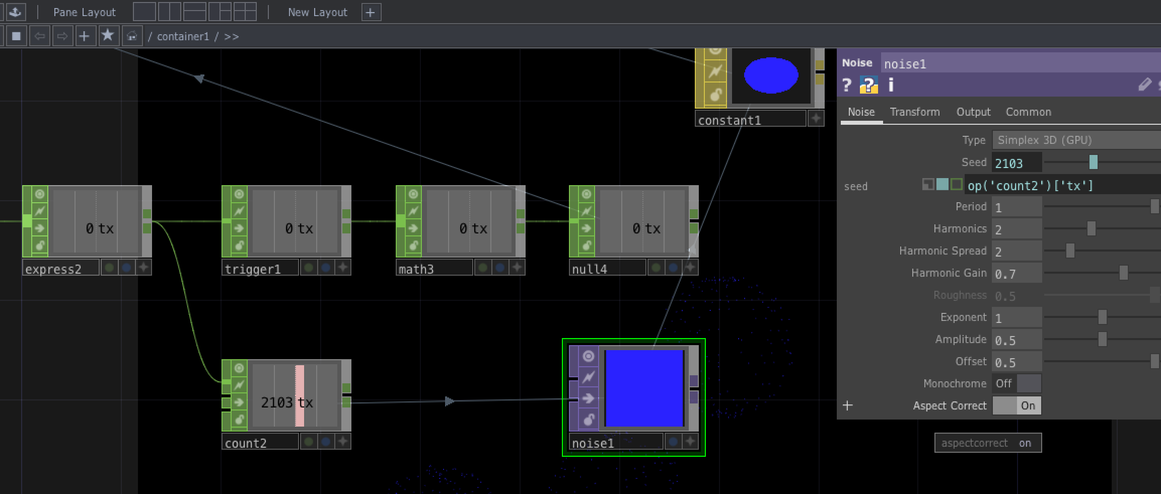 ②Count CHOPでカウントアップした値をNoise TOPにわたす