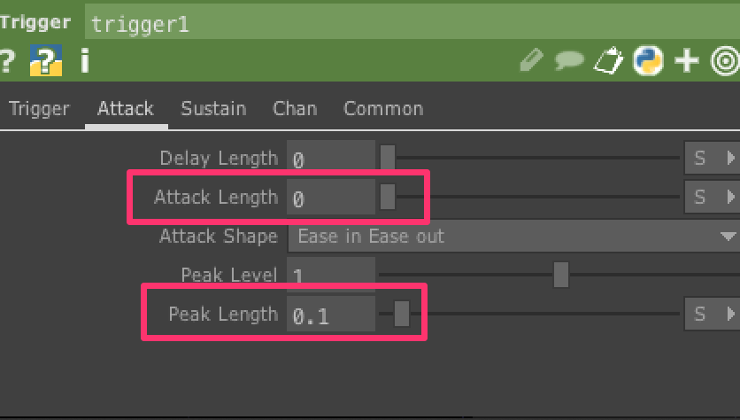 Attack Length(ピーク値到達する時間)を0にします。 Peak Length(ピークを維持する時間)を0.1にします。