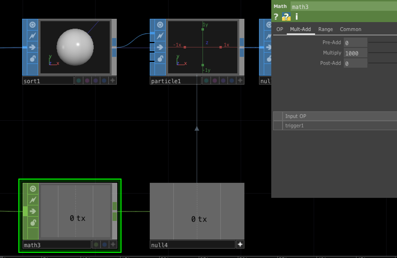Particle SOPのBirthにTrigger CHOPで作った値を設定します。 ただし、Trigger CHOPの値が小さい為、Math CHOPで1000倍にします。