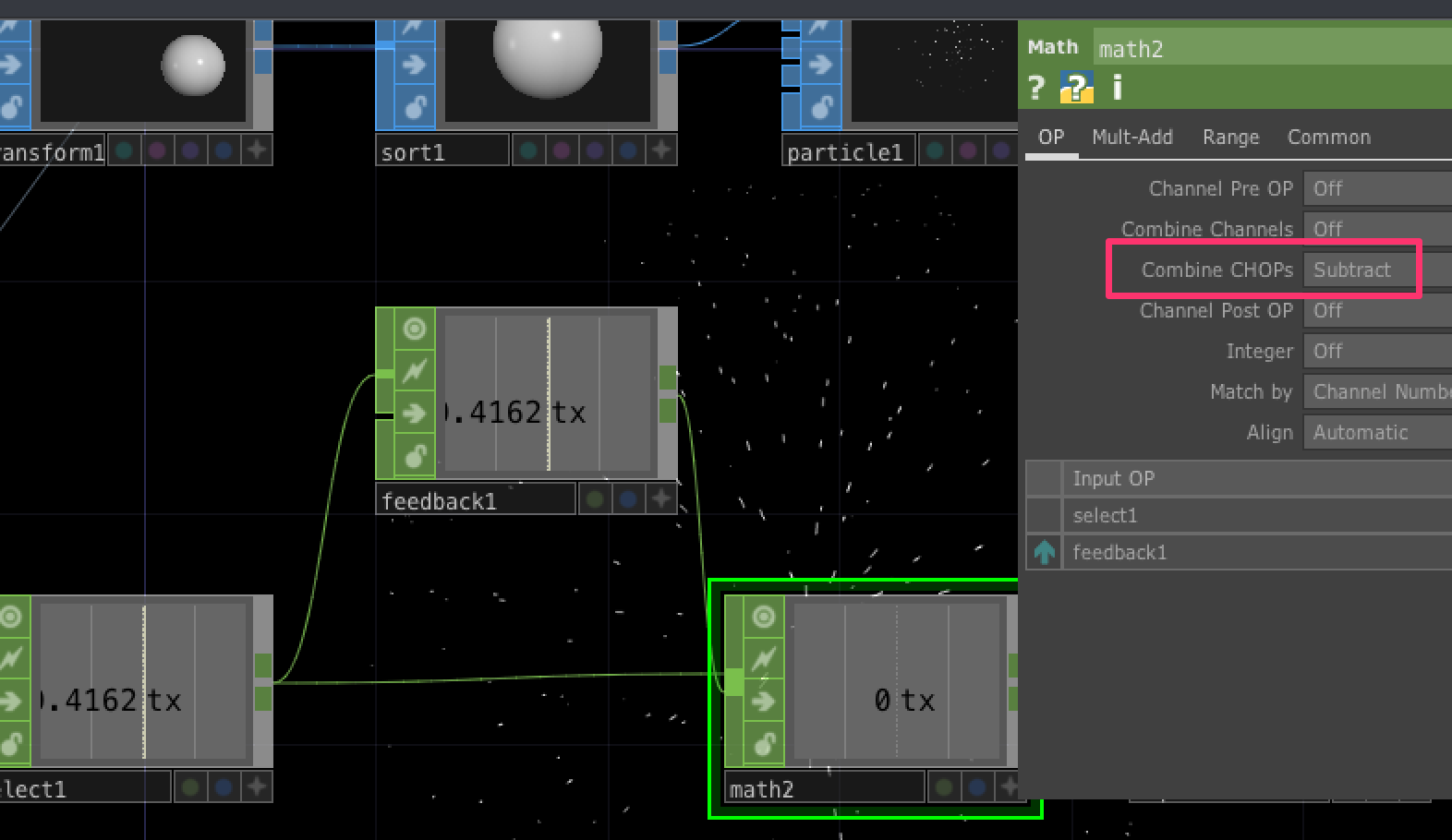 Math CHOPのCombine CHOPsをSubtractにすることで、現在の座標と、1フレーム前の座標を引き算してくれます。