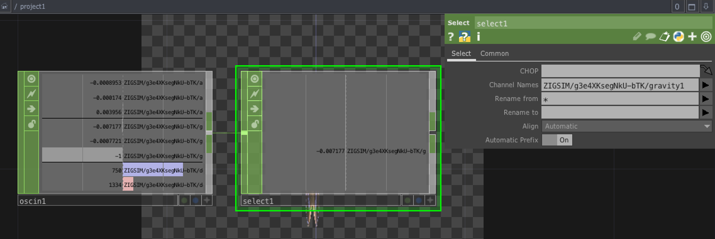 今回はgravity:xだけ利用するのでSelect CHOPで値を選択します。