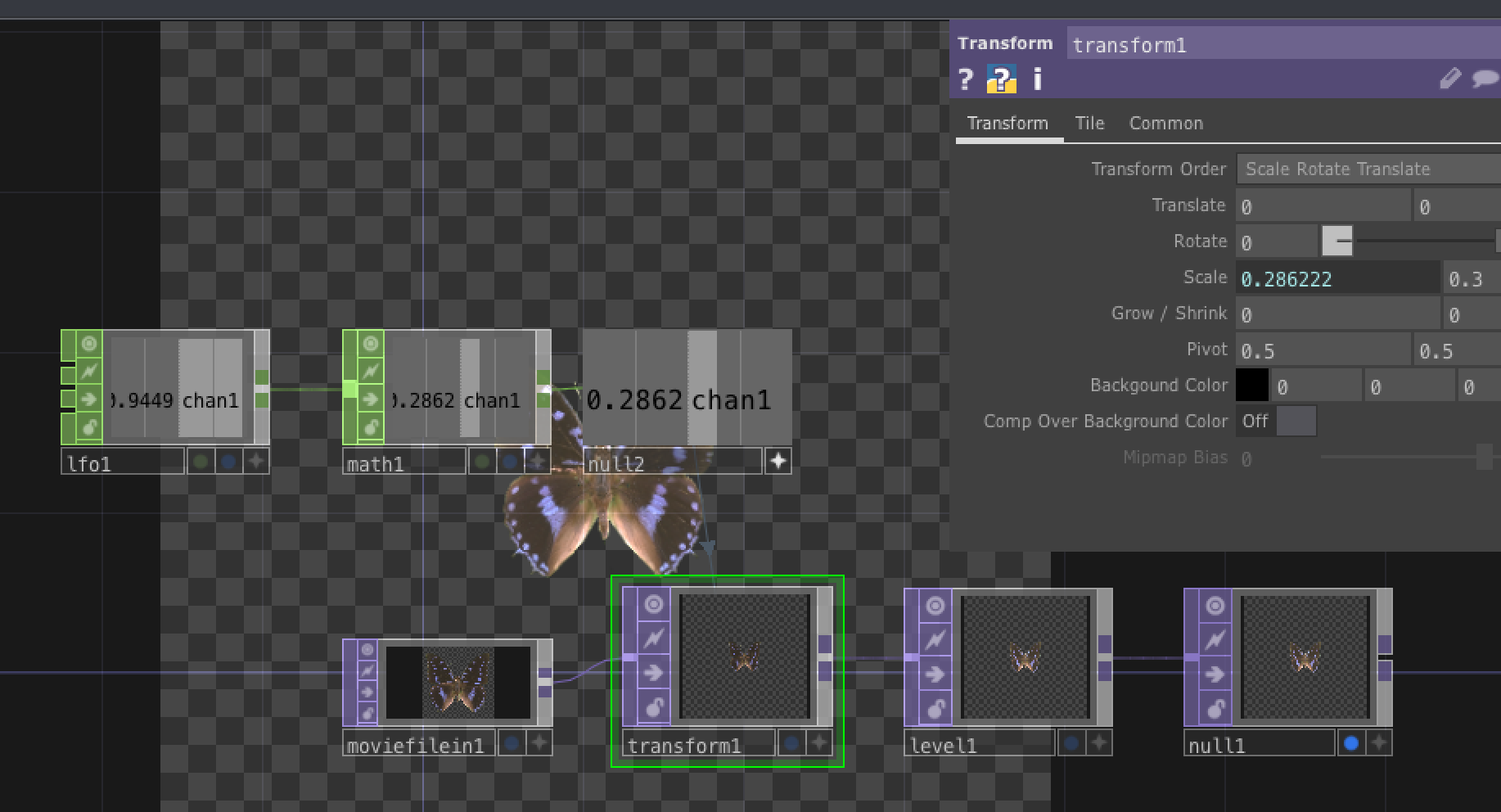 LFO CHOPで作った値をTransform TOPのScale xに設定します。